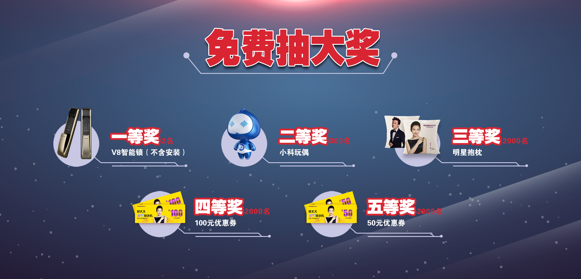 每日可免費(fèi)抽獎(jiǎng)一次,價(jià)值2998元的科徠尼高鐵專列版V8、明星抱枕、小科玩偶、100元/50元優(yōu)惠券天天送。