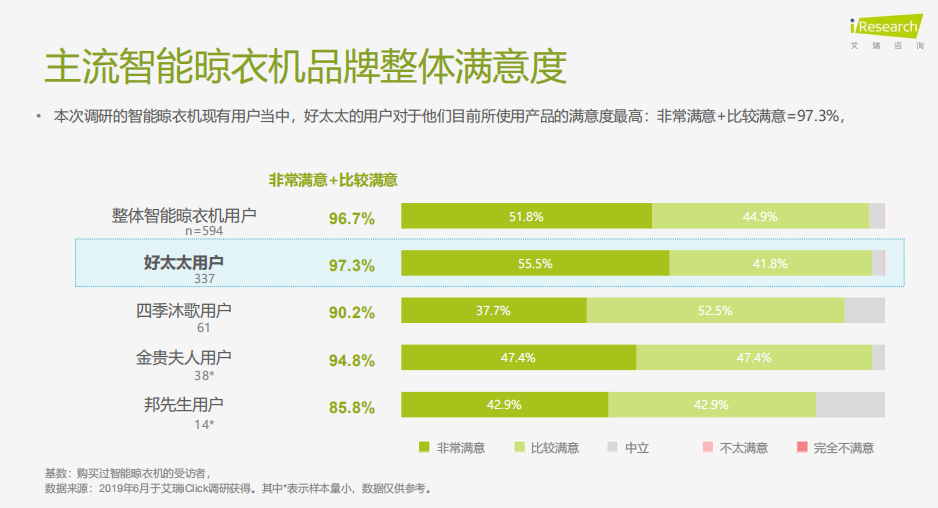報(bào)告數(shù)據(jù)公開(kāi)可知,好太太的品牌認(rèn)知度更是達(dá)到78.6%,且調(diào)研的已購(gòu)買(mǎi)和正在使用智能晾衣機(jī)的消費(fèi)者當(dāng)中,近6成購(gòu)買(mǎi)過(guò)好太太的智能晾衣機(jī),他們對(duì)目前所使用產(chǎn)品的滿意度最高達(dá)到 97.3%。數(shù)據(jù)背后體現(xiàn)的是,所有品牌晾曬市場(chǎng)都不及好太太一家的體量大,好太太在業(yè)內(nèi)占不僅是“大牌子”,而是“超級(jí)大牌”。