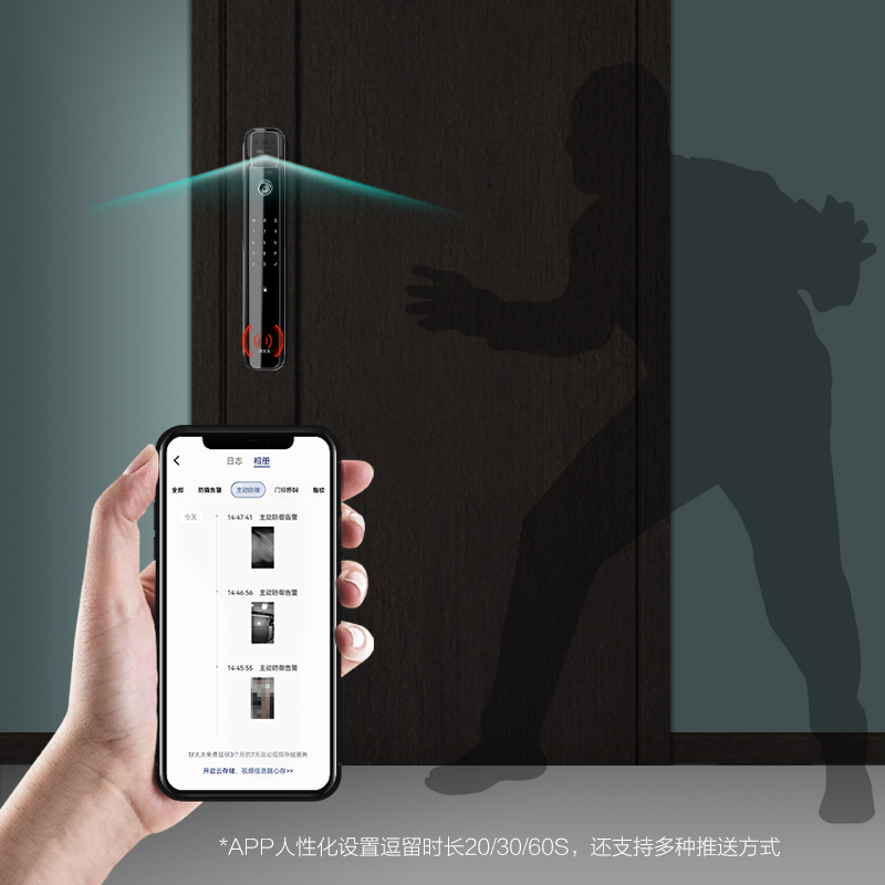 搭載紅外傳感器,門外感應1米范圍,陌生人異常逗留即會觸發偵測抓拍并推送實時拍攝的圖片到手機